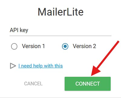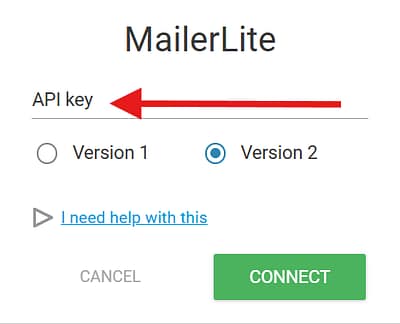 - After selecting MailerLite, choose the version you want to use. Select Version 2 and paste the API Token into the corresponding field.