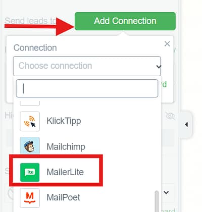 - Next, click Add Connection and choose MailerLite from the dropdown list of available integrations.