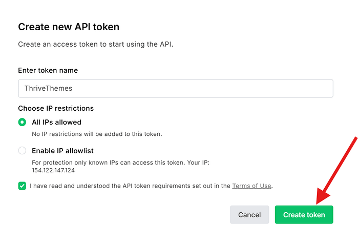 - Check the box to agree to the MailerLite Terms of Use, then click Create token.