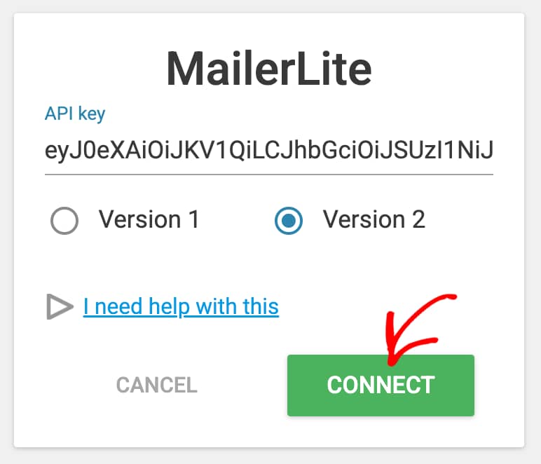 After you select MailerLite, select Version 2 and enter the API token you obtained by following the steps in the previous section.