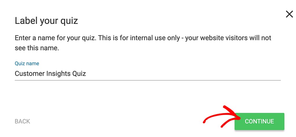 When you select to use a Gain Customer Insights template, enter the Quiz name in the next step and click the Continue button.