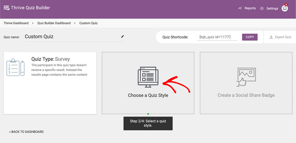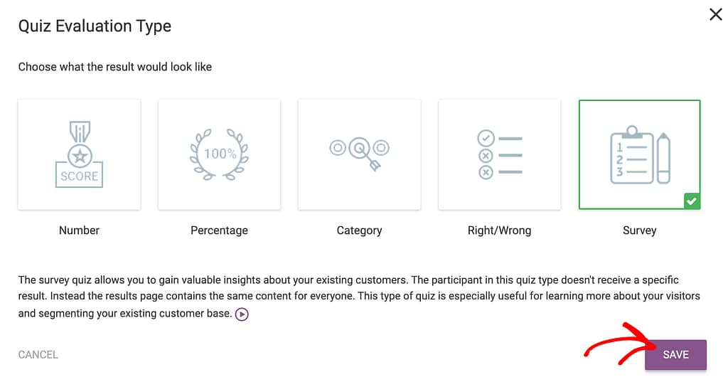 After you’ve selected the quiz type as Survey, click the next block to Choose the Quiz Style.