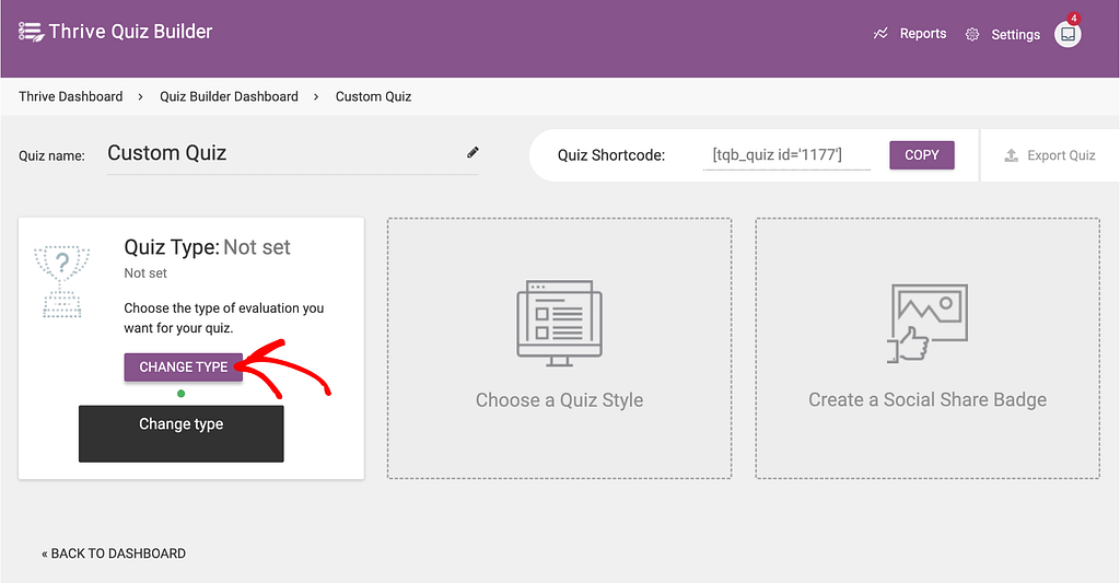 Instead, if you’ve selected Build from Scratch, on the quiz page, in the Quiz type block, click the Change type button.