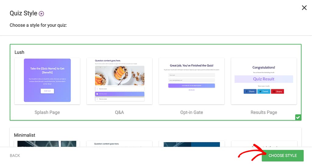 Clicking to select the quiz style, you’ll see a popup on which you select the style and click the Choose Style button.