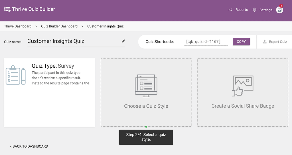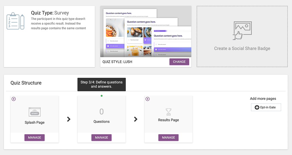 If you’ve selected the Gain Customer Insights template, and click Continue, you’ll be taken to the quiz page where you’ll see the quiz type selected as Survey by default.