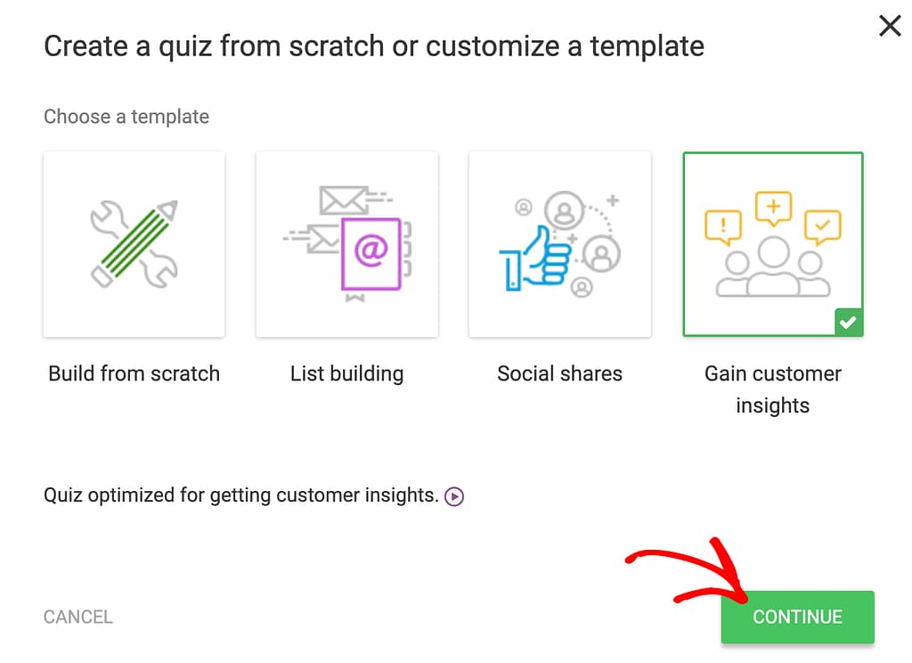 Since we’ll be showing you how to add a survey type quiz, we’ll select the Gain Customer Insights quiz template to proceed with. So, select the Go Customer Insights template and click on Continue.
