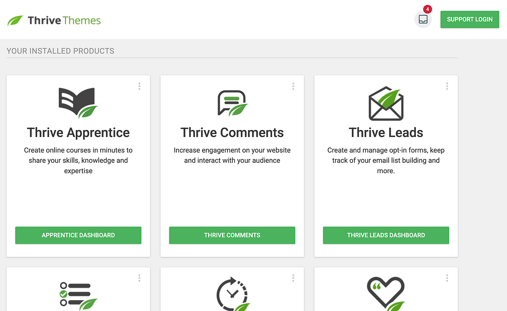 We’ve just seen how you can access the Thrive Dashboard page and the two sections in it. These two sections help you manage your Thrive Suite products and website features in one place.
