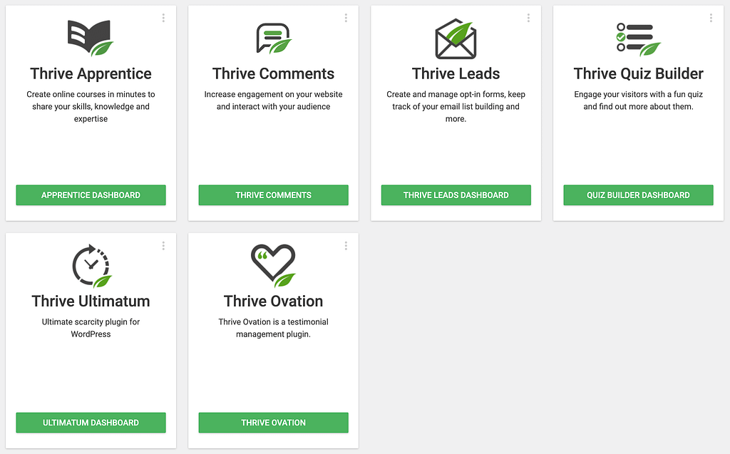 The Thrive Dashboard page lets you access each product dashboard by clicking the buttons on their respective blocks.