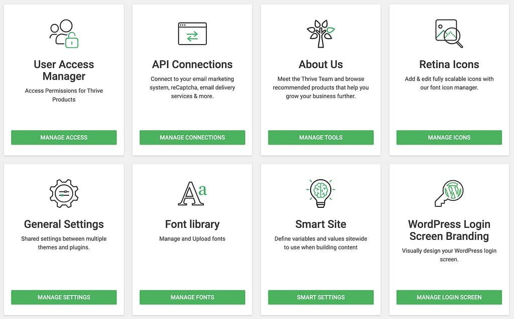 The Thrive Features section is different. It contains cards for different features and tools that Thrive offers. Each card leads to a different settings page where you can customize parts of your site, like design options or special functions.
