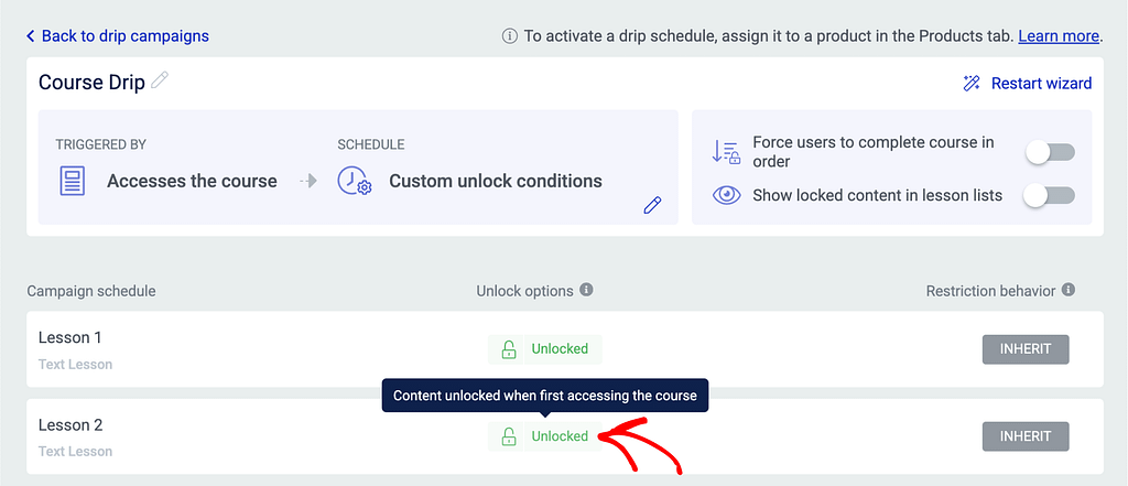 Under the Drip tab, click on the Unlocked link beside a lesson.