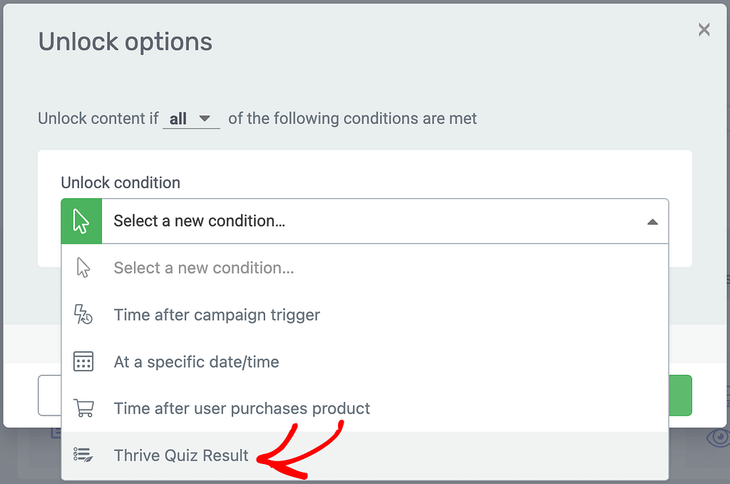 After clicking to add a new rule, select a new condition – Thrive Quiz Result.