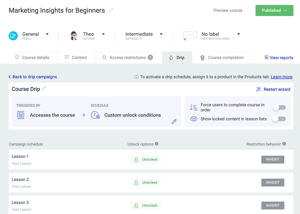 Since the product now has a drip schedule assigned to it, you can go ahead and also set up access rules for it, so that you make sure that students will be logged in when accessing the course.