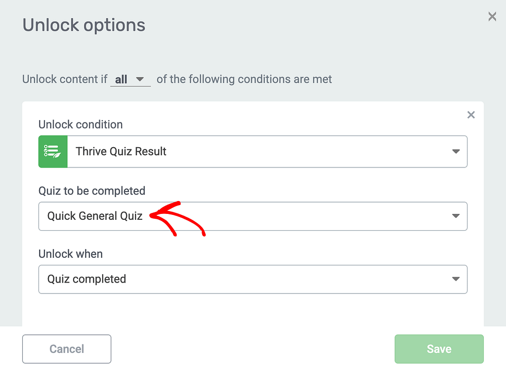 After you select Thrive Quiz Result, select the Quiz you want the user to pass. This should be the quiz you’ve added in the lesson.
