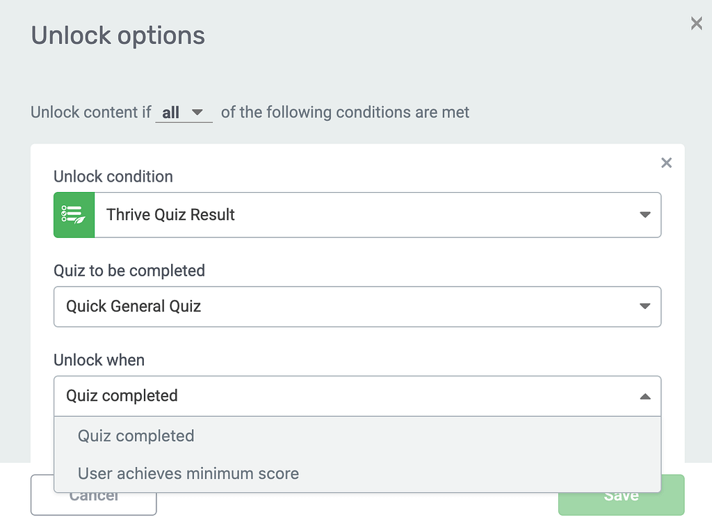 If the quiz was a “Category” type, you can choose to unlock the content for the users that have been assigned a certain category upon quiz completion: