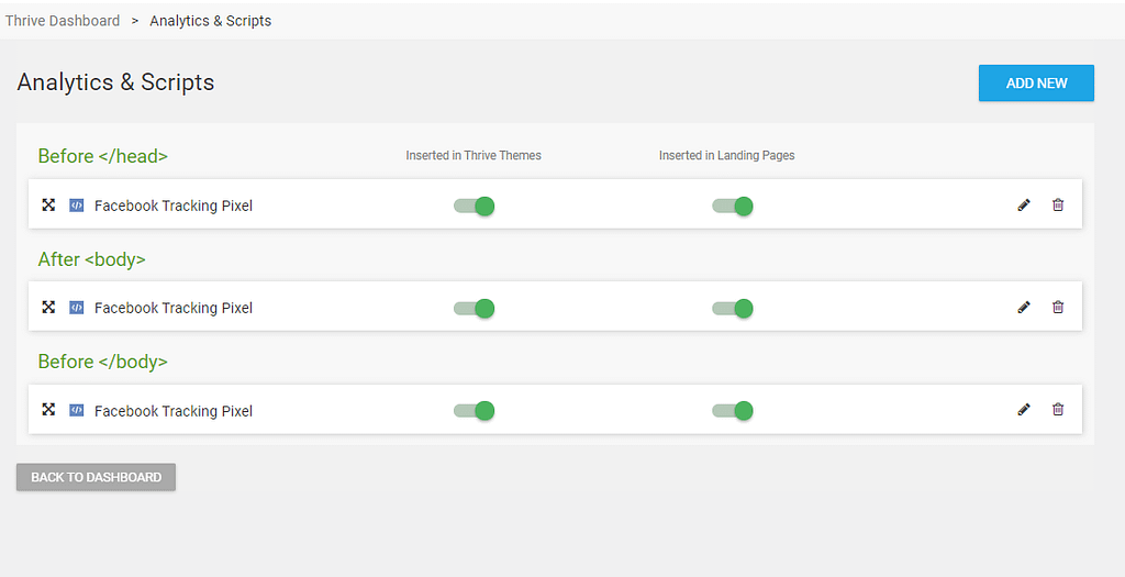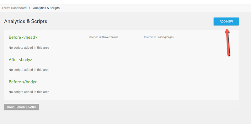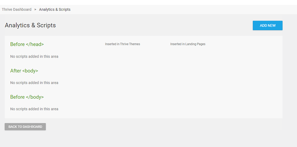 The Analytics & Scripts feature in Thrive Dashboard lets you manage tracking codes and custom scripts across your WordPress site globally without editing theme files or templates.