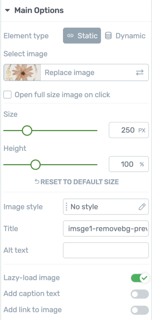The Element type setting lets you decide whether you want to add a static or a dynamic image on the page.