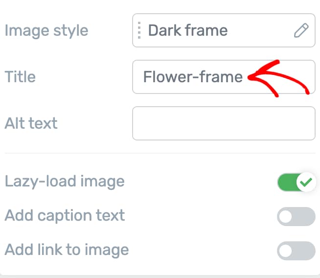 If you want to add an image title that shows up when a user hovers over the image on the page, use the Title setting to add an Image Title.