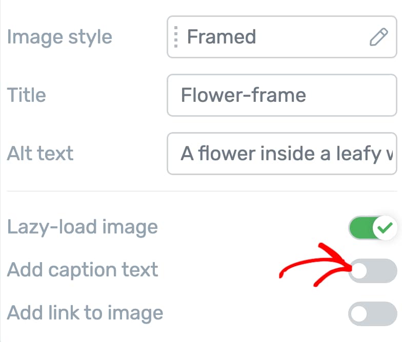 To add a caption text to an image, click the toggle button beside the Add caption text option.