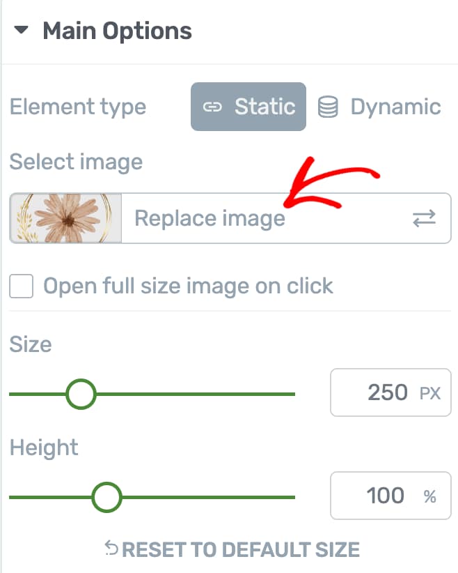 When you choose to add a static image on the page, the next setting allows you to select an image on the page. If you’ve already added an image, click Replace image.