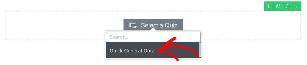 Clicking to select will display the available quizzes from Thrive Quiz Builder on your website. If you have too many quizzes on your website, you’ll see them listed or can search them using the search field.