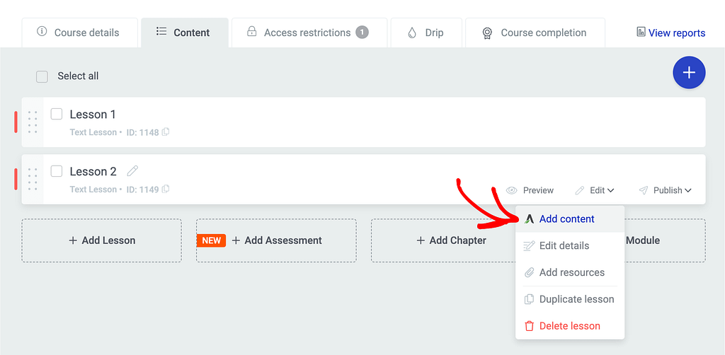 Under the Content tab, hover on the lesson you want to add the quiz to and further hover on Edit.