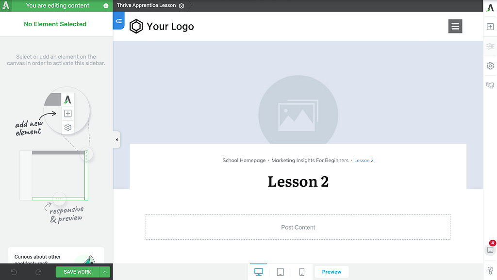 After you’ve installed and activated these plugins, create a course and a lesson using Thrive Apprentice and a quiz with the Thrive Quiz Builder.