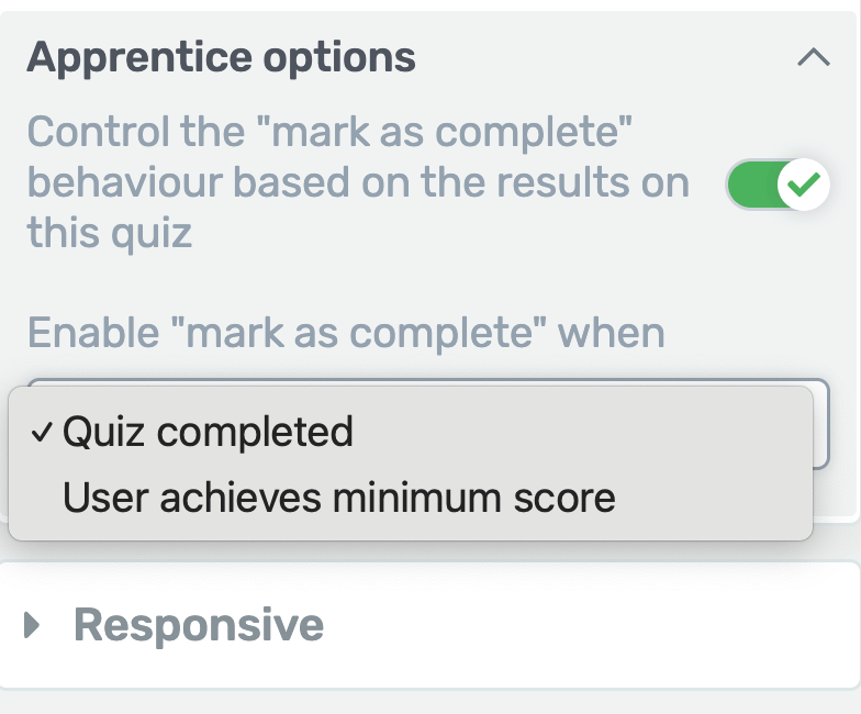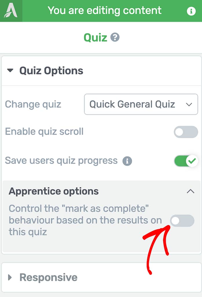 Expanding Apprentice options will let you enable the Mark as Complete feature that’ll act based on the result of the quiz. To do this click on the toggle button.