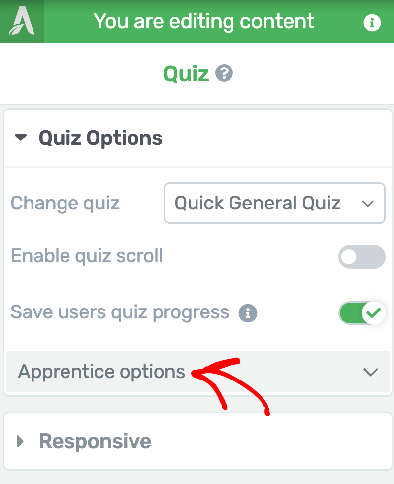Once a quiz is added to the lesson page, you’ll be able to edit the Apprentice options of the quiz. To do so, click on the quiz on the page to open its options in the left column, and click on Apprentice options.