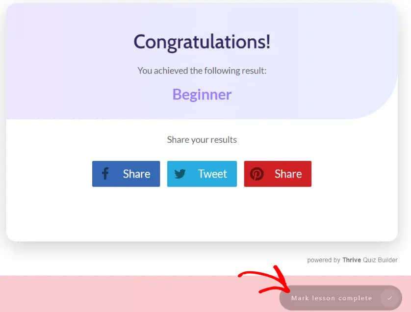 In other words, whenever you place a quiz within a Thrive Apprentice lesson, you can prevent the students who do not meet the required test score from advancing with the course and mark the lesson as complete. They will only be able to advance to the next lesson once they take the quiz and manage to get the result set by you.