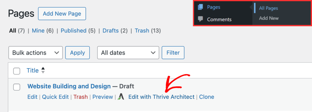 To add the Text element to a page, begin by opening the page in the Thrive Architect editor. To do so, open your WordPress admin area, Pages >> All Pages, hover on the page you want to edit and click Edit with Thrive Architect.