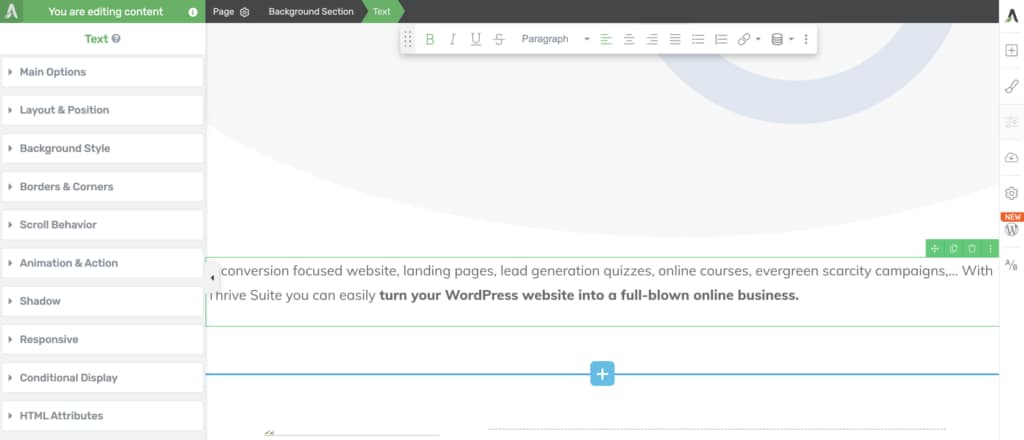 Like the other Thrive Architect elements, the Text element also has some options that will open in the left column. To see these, click on the Text element on the page.