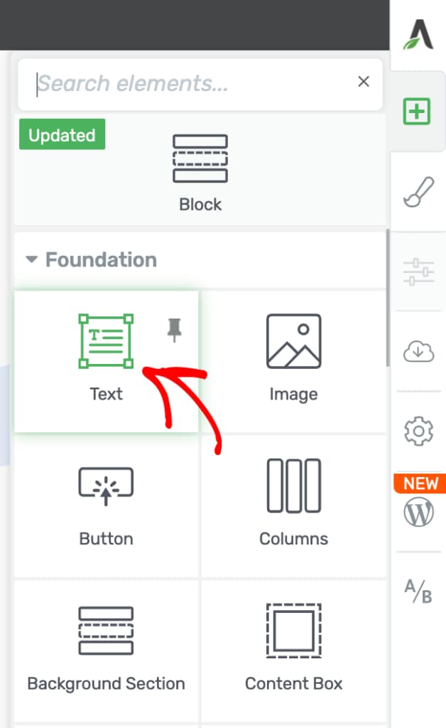 Clicking on the plus icon will open up the list of Thrive Architect elements to choose from. From this list, drag and drop the Text element on the page.