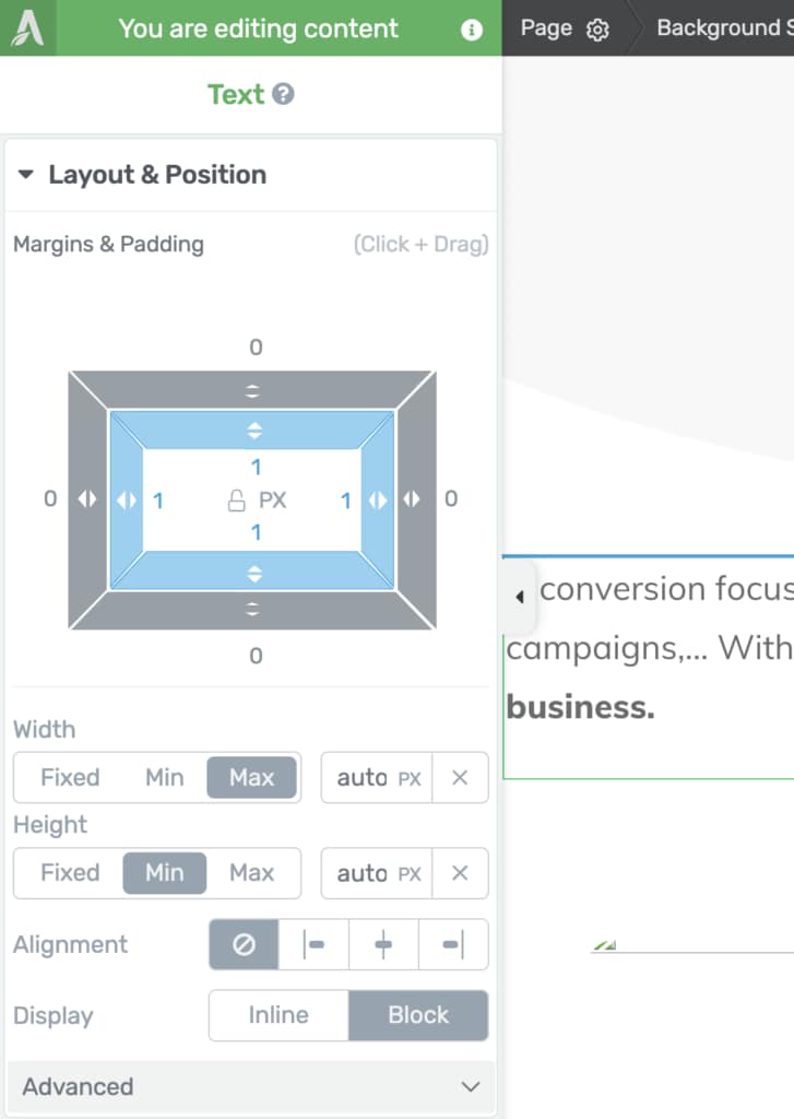 - Advanced: The advanced settings under the Layout and Position options for the Text element let you further manage the position of it. You can read more about it here.