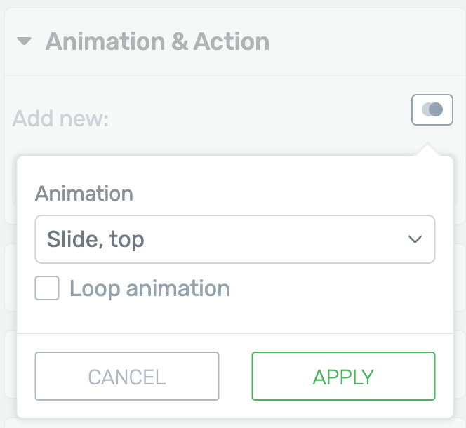 The Animations and actions tab lets you select effects like Slide top, slide bottom, zoom in, zoom out, etc. for the Text element.