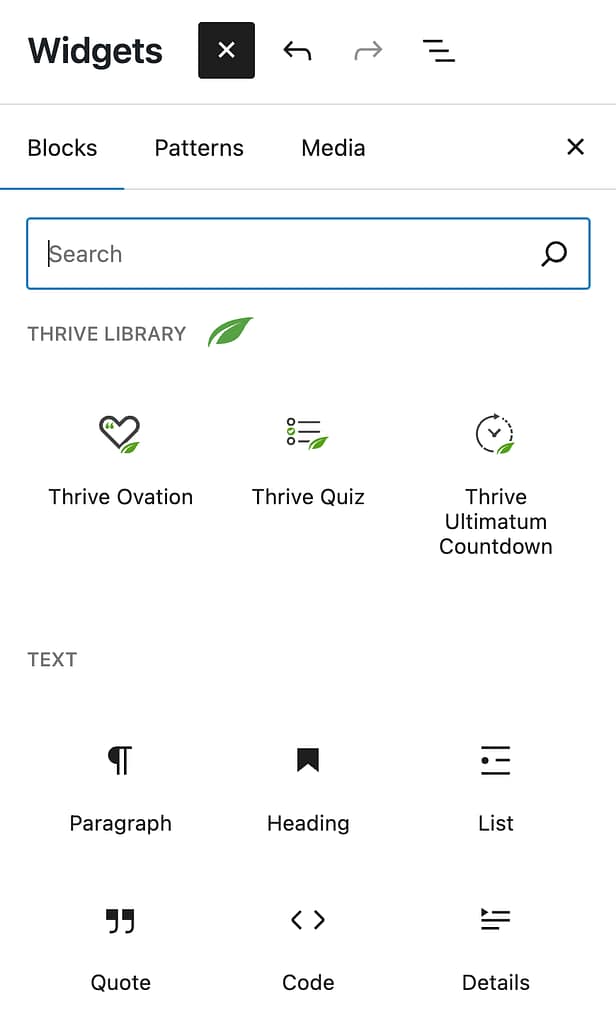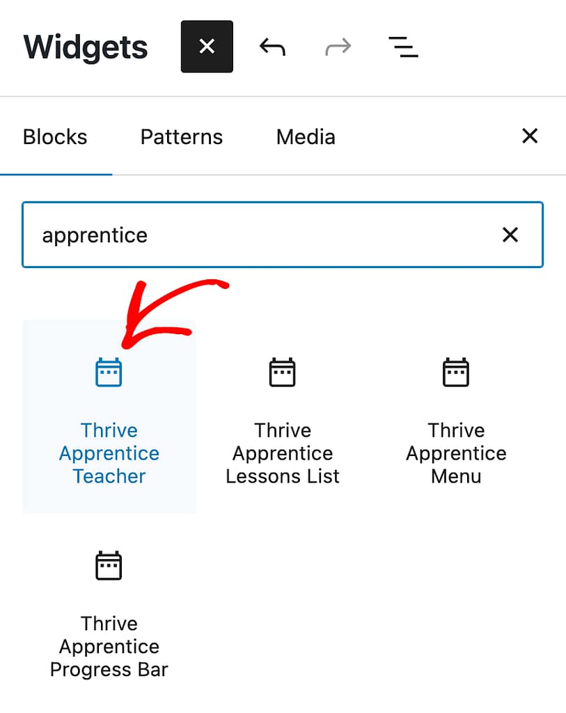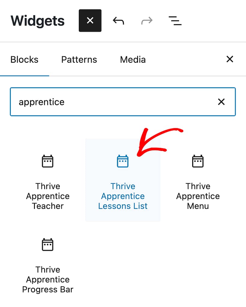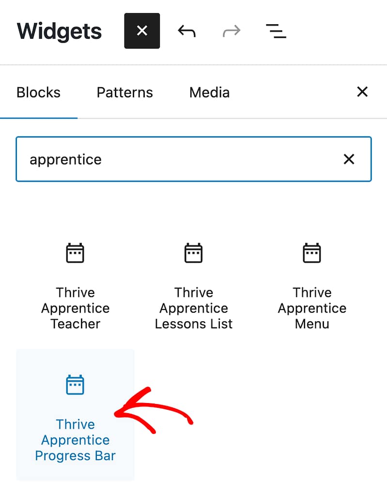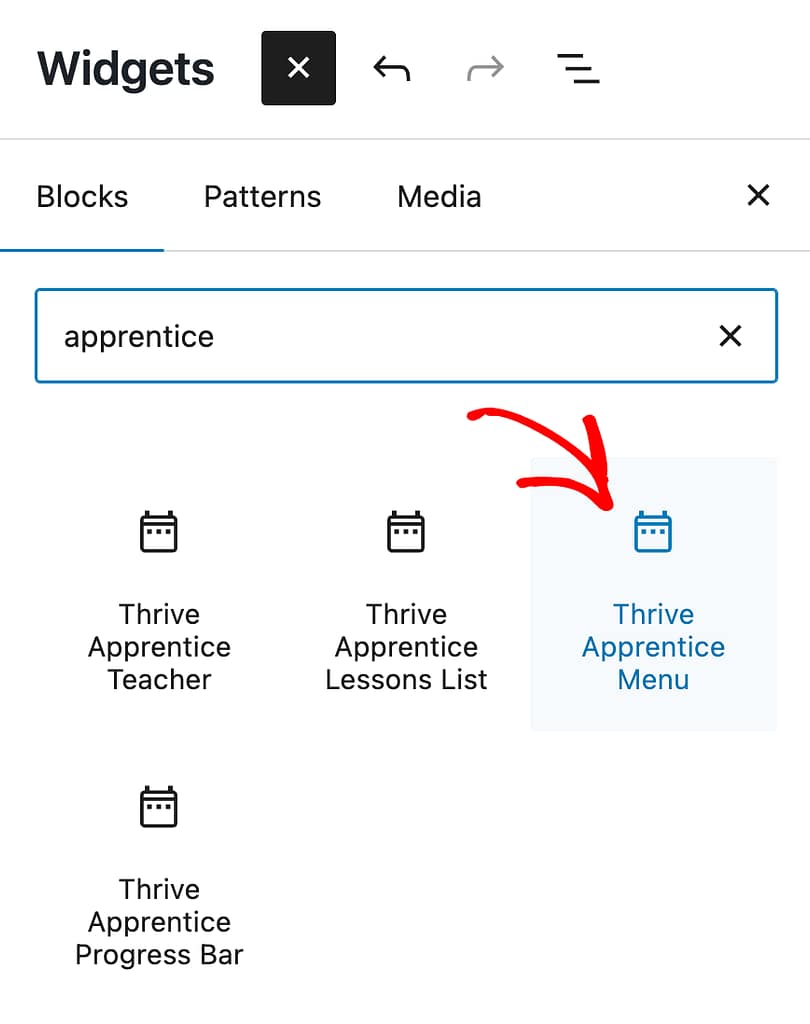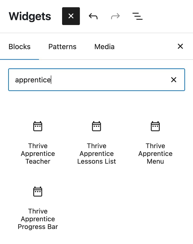 To see the different types of Thrive Apprentice widgets you can use, start typing Apprentice in the search bar.