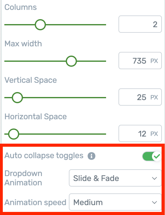 With auto-collapse enabled, clicking a new toggle will immediately collapse the last one left open. This way, you can force only one toggle open at a time.