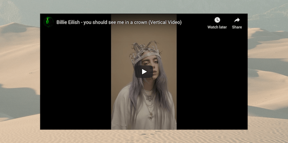 Here is an example vertical video courtesy of Billie Eilish using the standard YouTube embed. The first image is using the default video aspect ratio, and the second is using 9:16 vertical video aspect ratio.