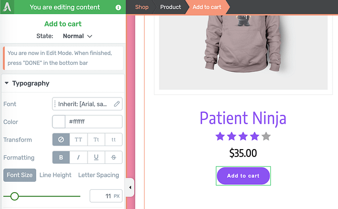Inside of Edit Design mode, you can just click on anything inside the shop, make your changes, and it will apply like a template. That means that as your visitors browse through products in your shop, your new design style will apply to all products.