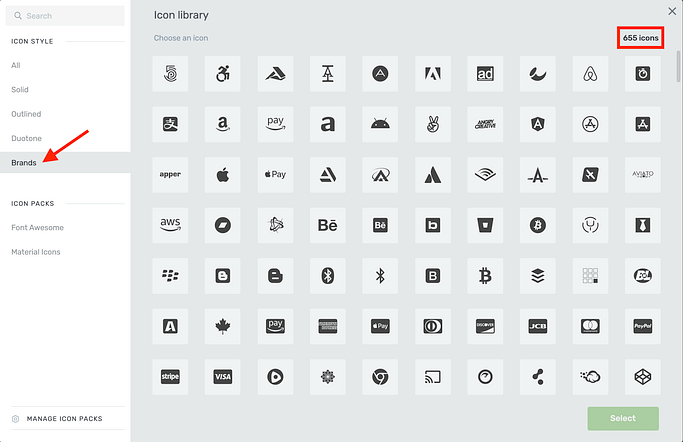 The Brands tab in the Icon Library now has 655 free brand icons.