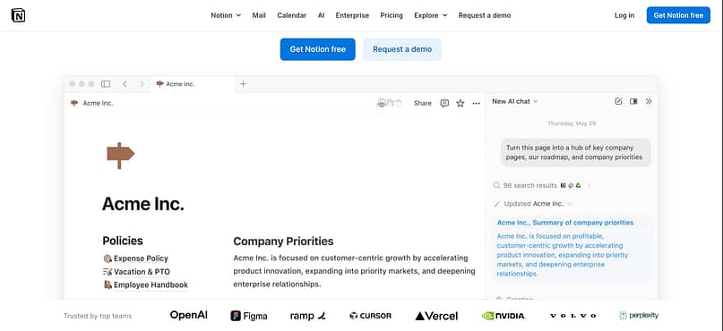 Notion showcases live demos directly on the homepage, letting users “test” the product instantly.