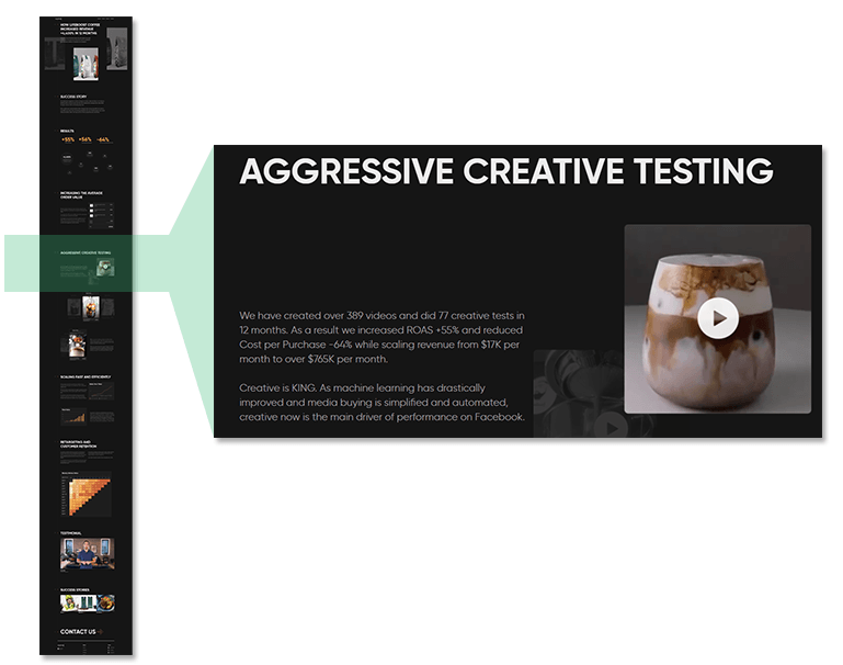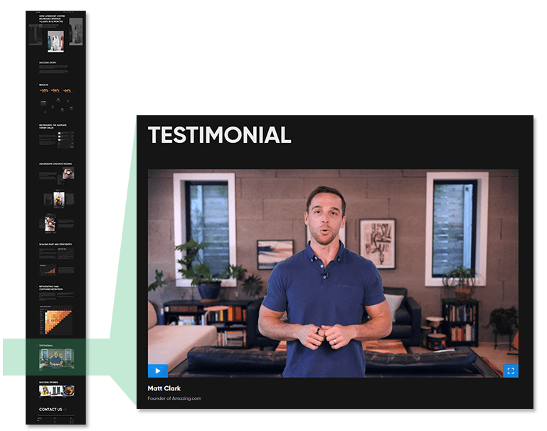 Great video and article, thanks so much! I was wondering: Is there a particular reason for placing the video testimonial towards the bottom using a button link at the top? Why not just place the video inside the hero section? Thank you!