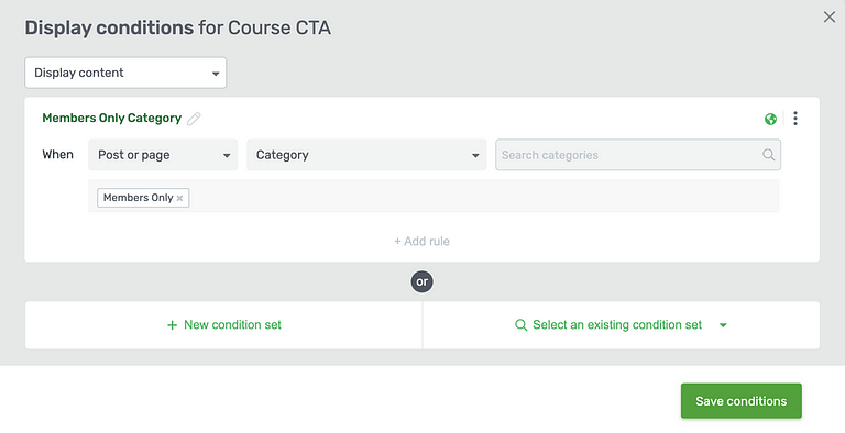 - Post or Page rules, such as which category the article is in, if it has a specific tag, or who the author is.