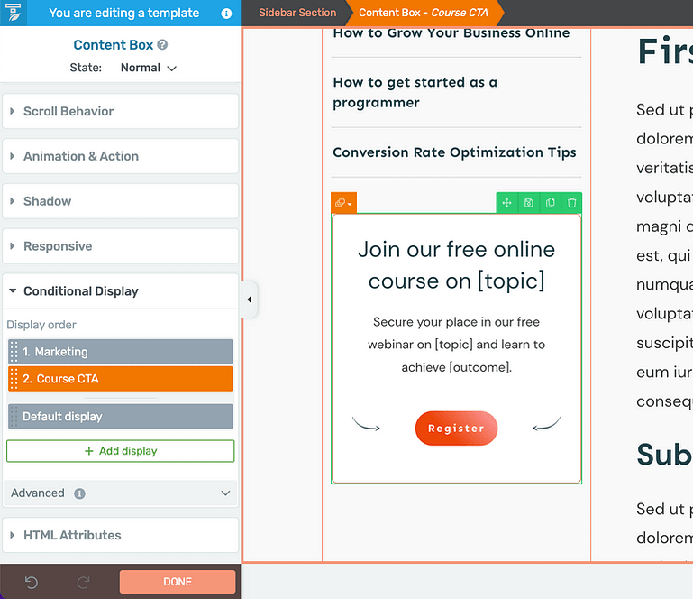 Conditional display is available in the Thrive visual editor on background sections, content boxes, menus, blocks and text elements. Simply wrap a widget, call-to-action, or any content in one of those containers, and you can apply some display rules.