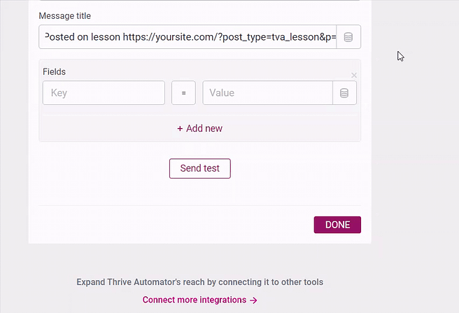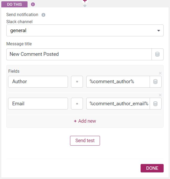 - Enter text in the "Key" field and choose a value for the field using the button that resembles a stack of coins. The data that's available will be dynamic and based on the chosen automation trigger. Let's say, for example, you choose "User leaves comment" as the trigger for this automation — which is available inside the WordPress triggers. Now, the data available is based on the data received when someone leaves a comment. Let's assume you want to know who commented, in that case you could type "Author" in the key field and choose the data "Comment author name" using the "stack of coins" button in the value field.