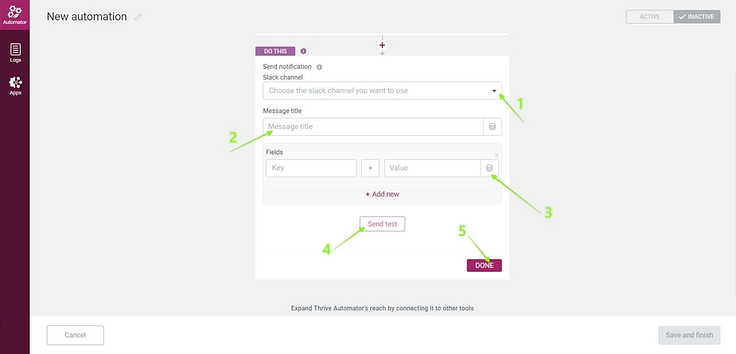 Slack Send notification options in Thrive Automator