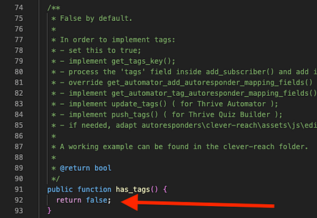 In this example, it describes to a developer that if they're building an email integration and they want to add tags, all they have to do is set a default value from FALSE to TRUE, and follow the steps to set up their functions.