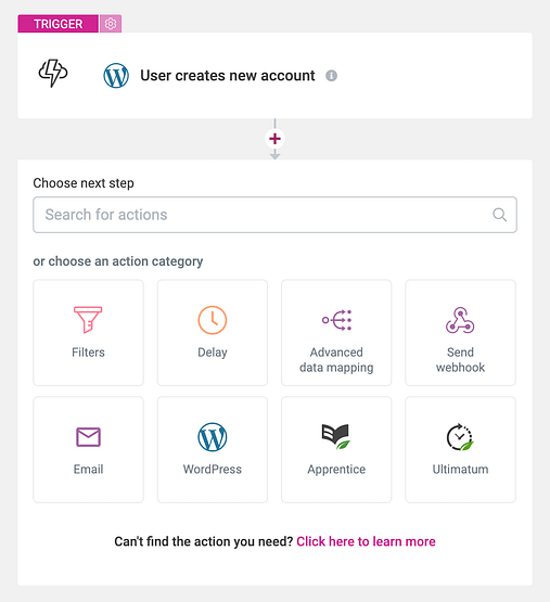 In the image above, the trigger 'User creates new account' obviously provides user data. That means that any and all actions that depend on user data will be available to select. But if you had a different trigger that doesn't provide user data, then some of those actions would be hidden... and others would be made available instead.