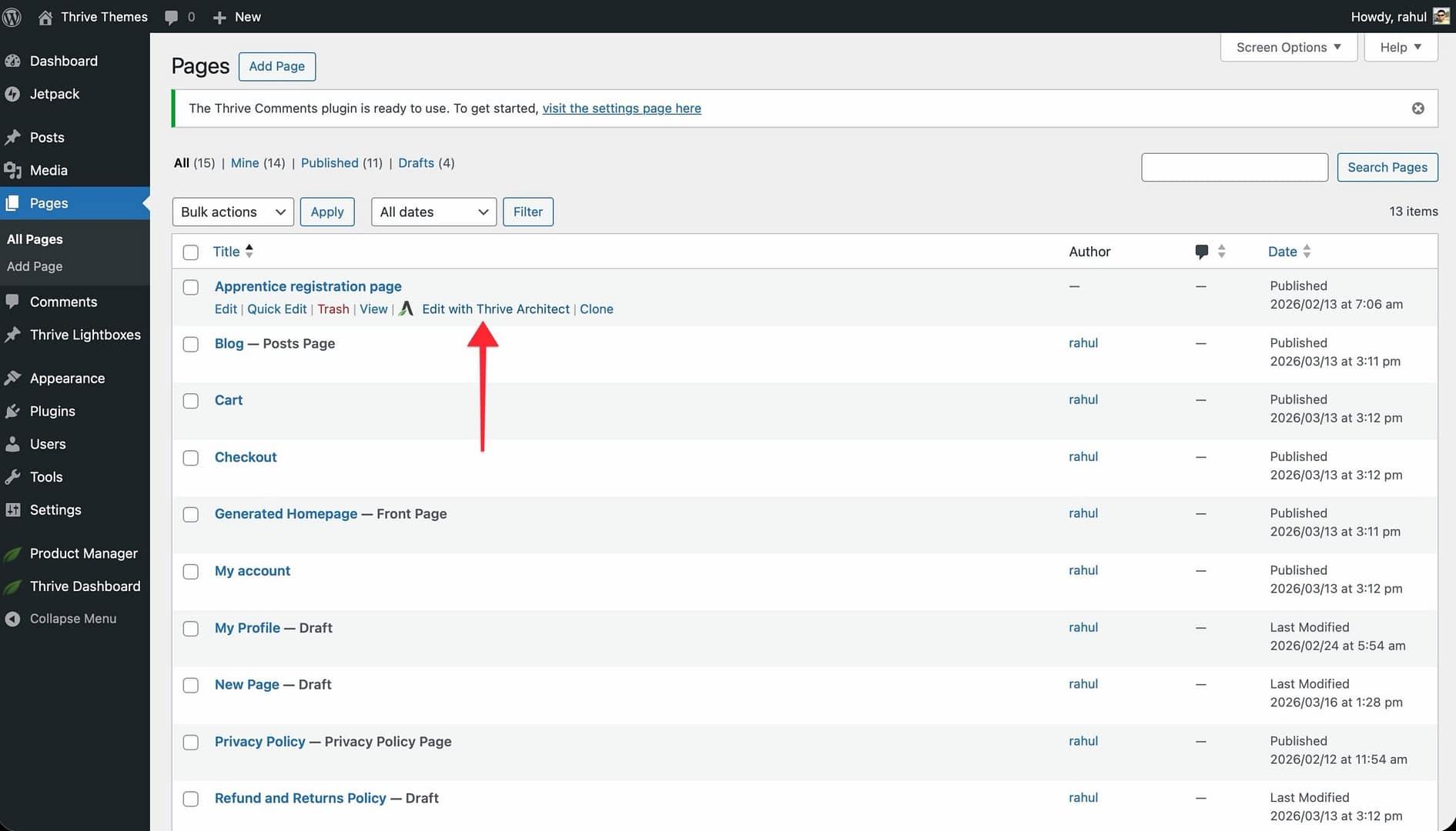 - Click Edit with Thrive Architect from the hover menu.