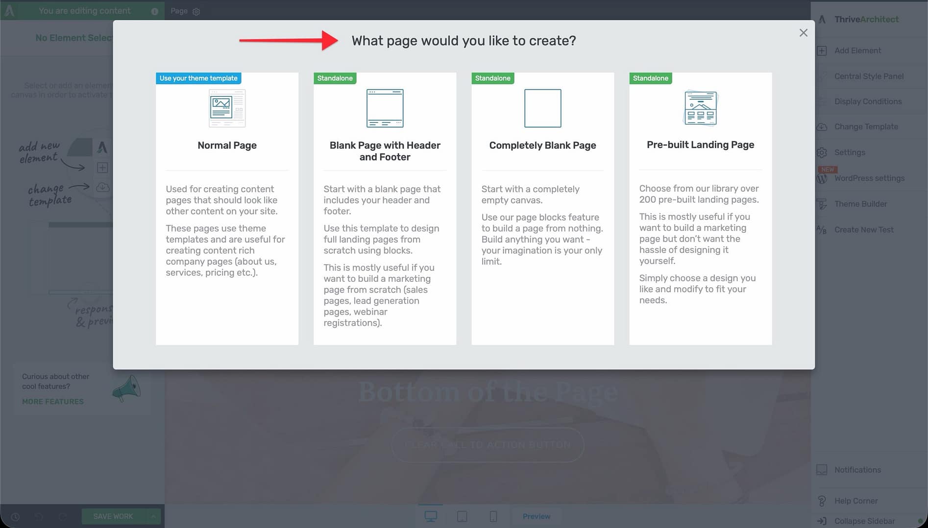 - Completely Blank Page — A fully empty page with no header, footer, or theme elements. Available when using Thrive Theme Builder.