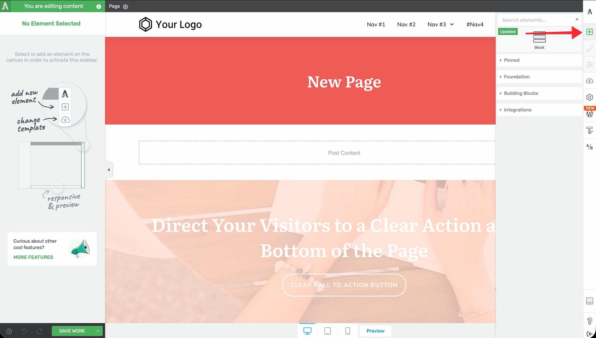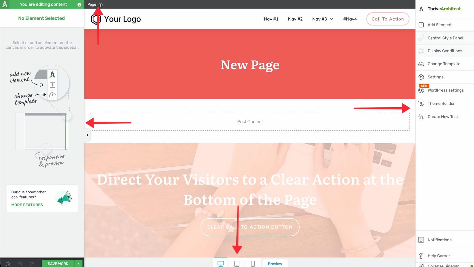 The Thrive Architect editor has four main areas: